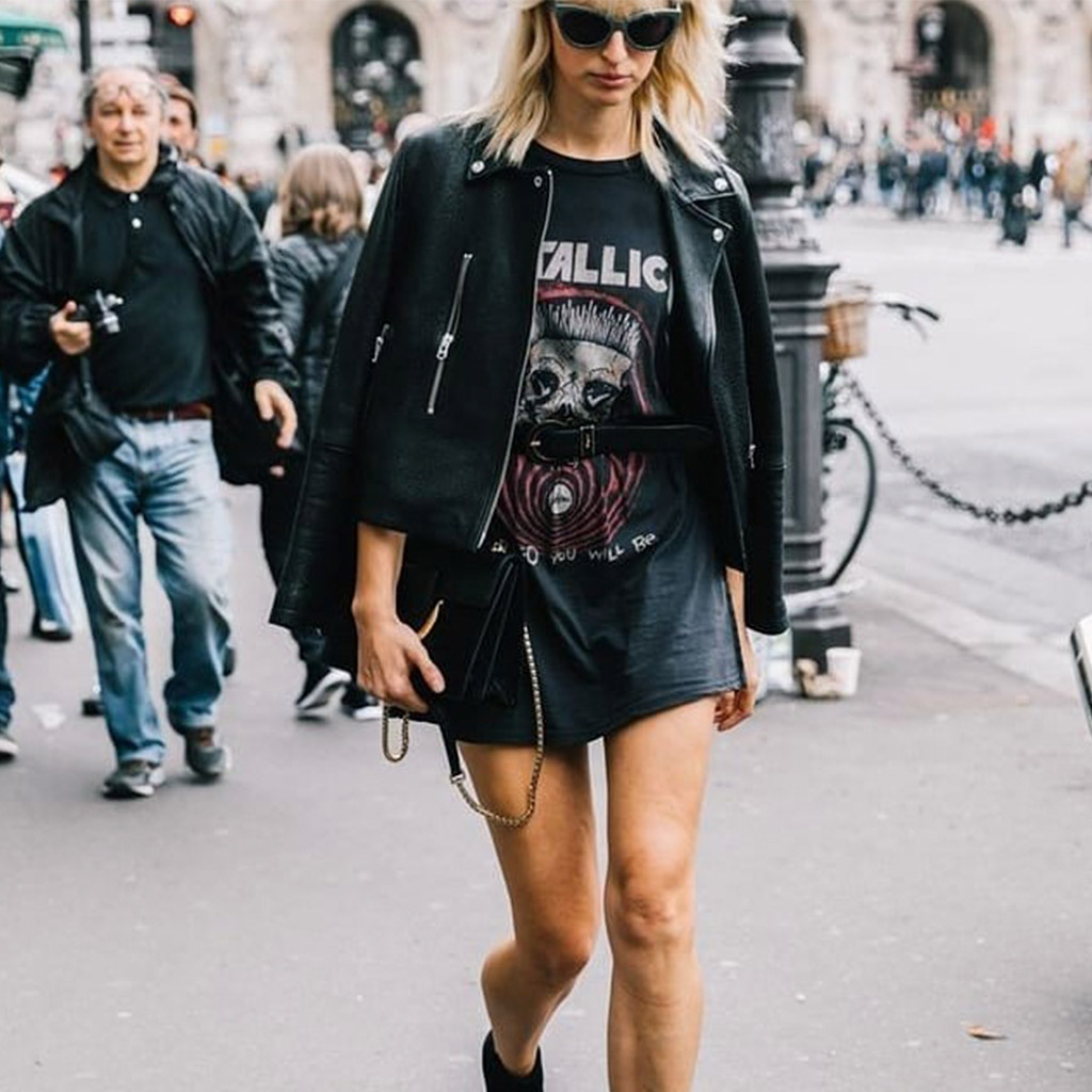 Напевно в його колекції завалялася парочка запраних футболок з логотипами рок-груп. Це саме те, що потрібно! Вони ідеально підходять не тільки для того, щоб полежати в них перед телевізором, а і як нижній шар: одягай їх під джинсовку оверсайз або піджак, накинуті на твої тендітні плечі. Футболки з принтами складуть вдалу компанію звуженим джинсам і спідницям різної довжини.