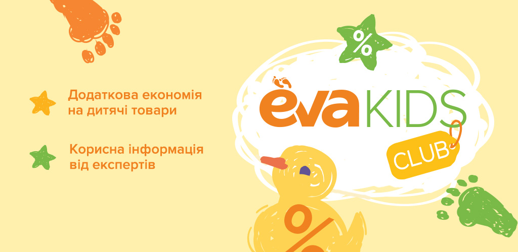 EVA KIDS CLUB (далі – Клуб) є невід’ємною частиною Програми лояльності EVA МОЗАЇКА та відповідає всім його правилам. Учасники Клубу мають змогу отримати додаткові знижки та спеціальні пропозиції (далі – Заохочення) під час здійснення покупок в офлайн магазині EVA ТОВ «РУШ» на товари з категорій «Догляд за малюками», «Сповивання та гігієна малюків», «Товари для вагітних і годуючих мам».