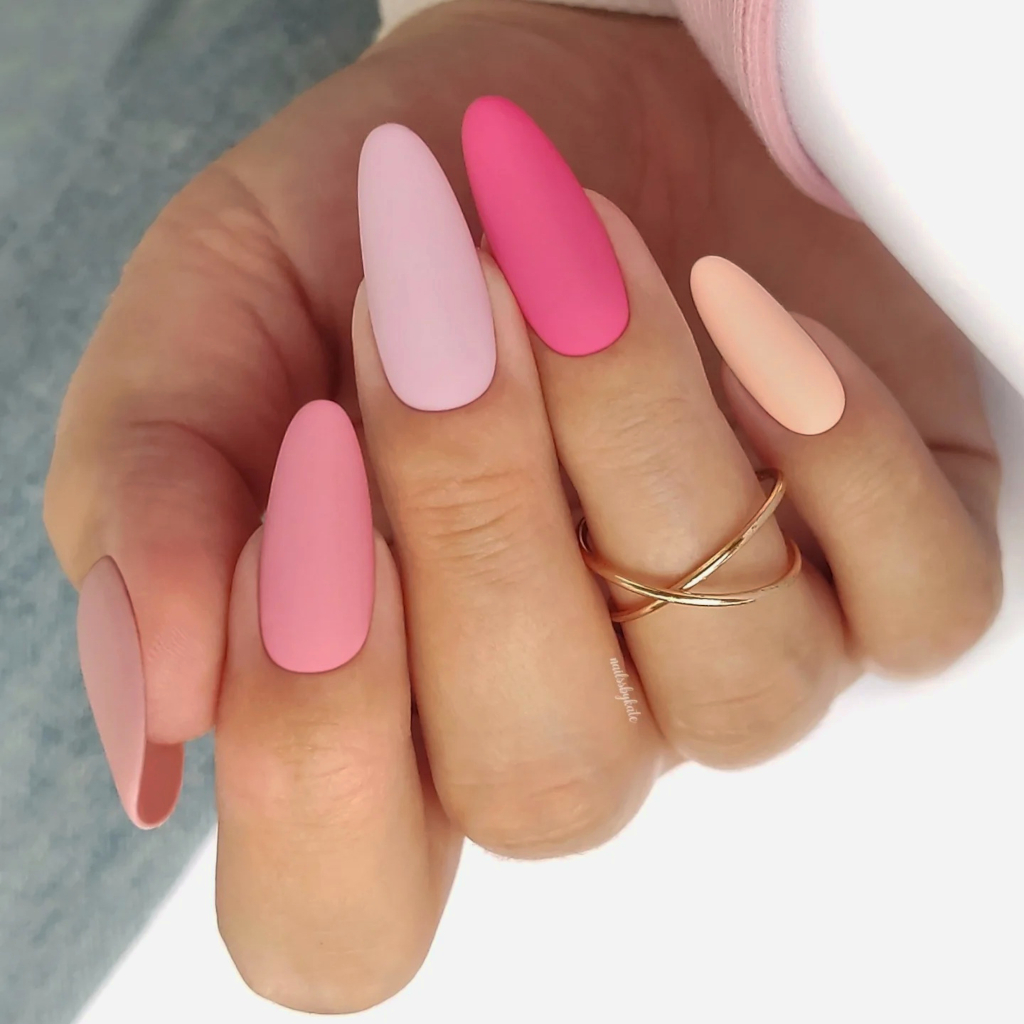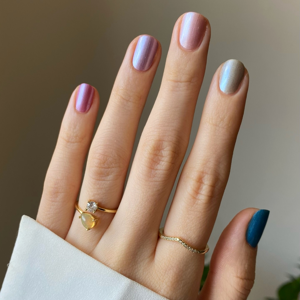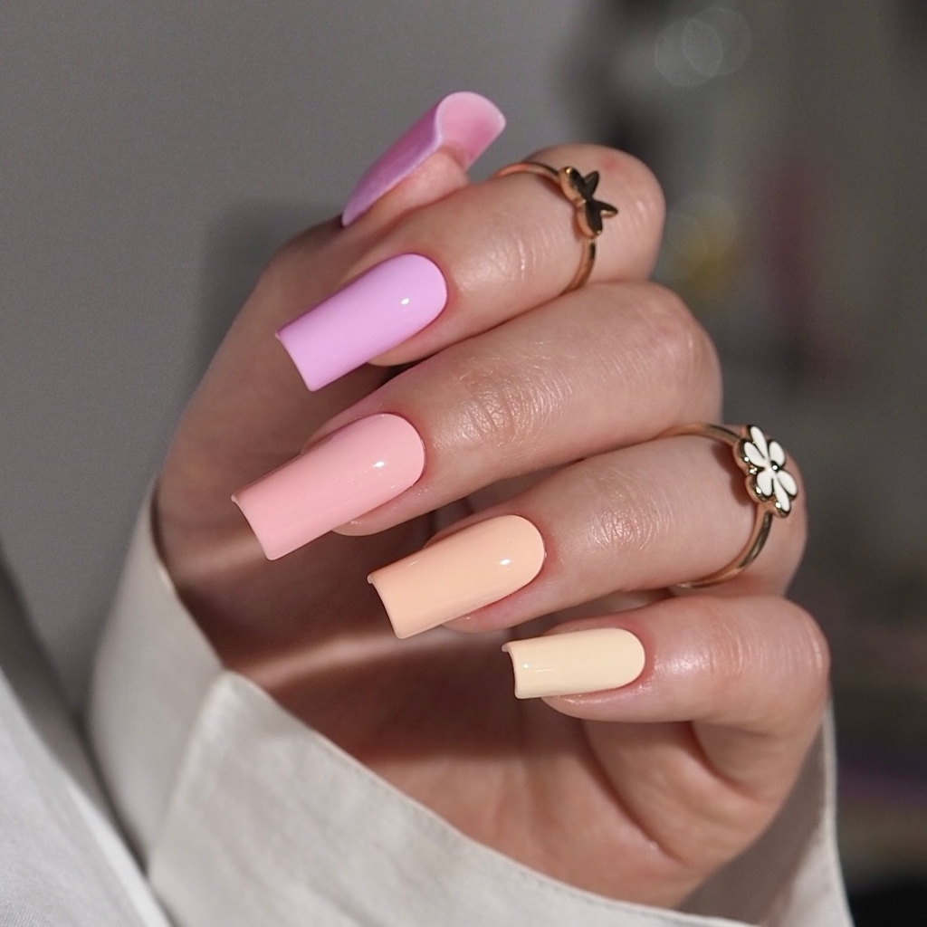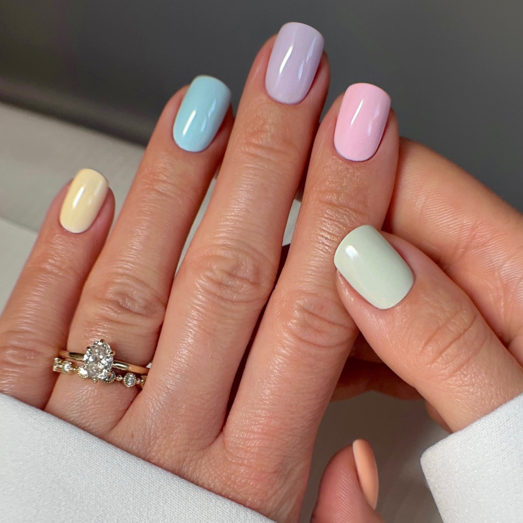Різноколірний манікюр у ніжних пастельних тонах має дуже легкий і весняний вигляд. Можна взяти палітру глибоку і насичену, щоб отримати більш строгий і сучасний варіант. А ще можна зробити подібний дизайн не тільки в глянці, але також і в матовому або перламутровому виконанні. Головне — щоб обрані відтінки створювали perfect match.