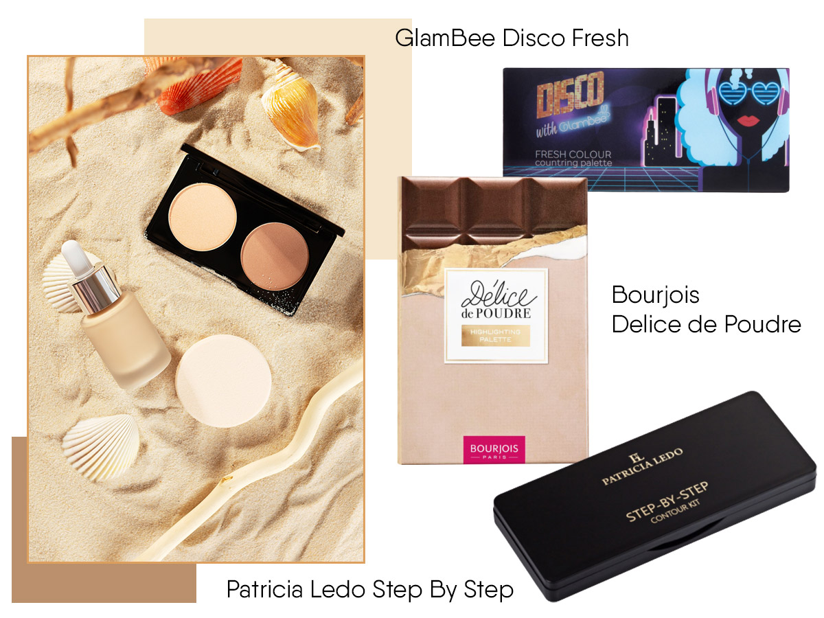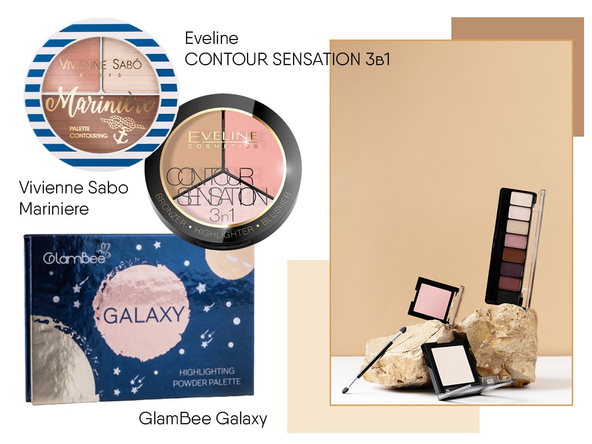Для такого макіяжу знадобиться мінімум два продукти — бронзер для затемнення та хайлайтер для висвітлення. Щоб додати свіжості, використовують також рум’яна. Вони можуть входити до палетки, а можуть використовуватися окремо, як вам зручніше.