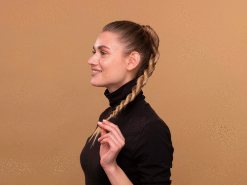 - Выделили прядь под плетение. Обработай ее лаком и сделай очень тугую косичку. Закрепи ее силиконовой резинкой.