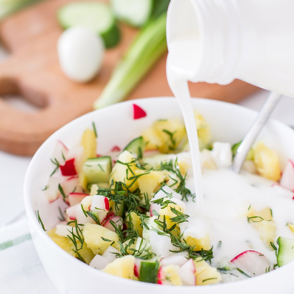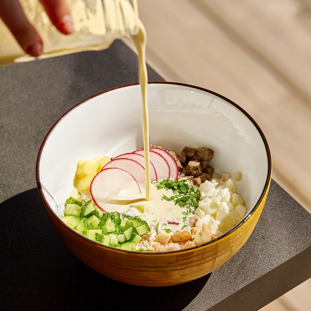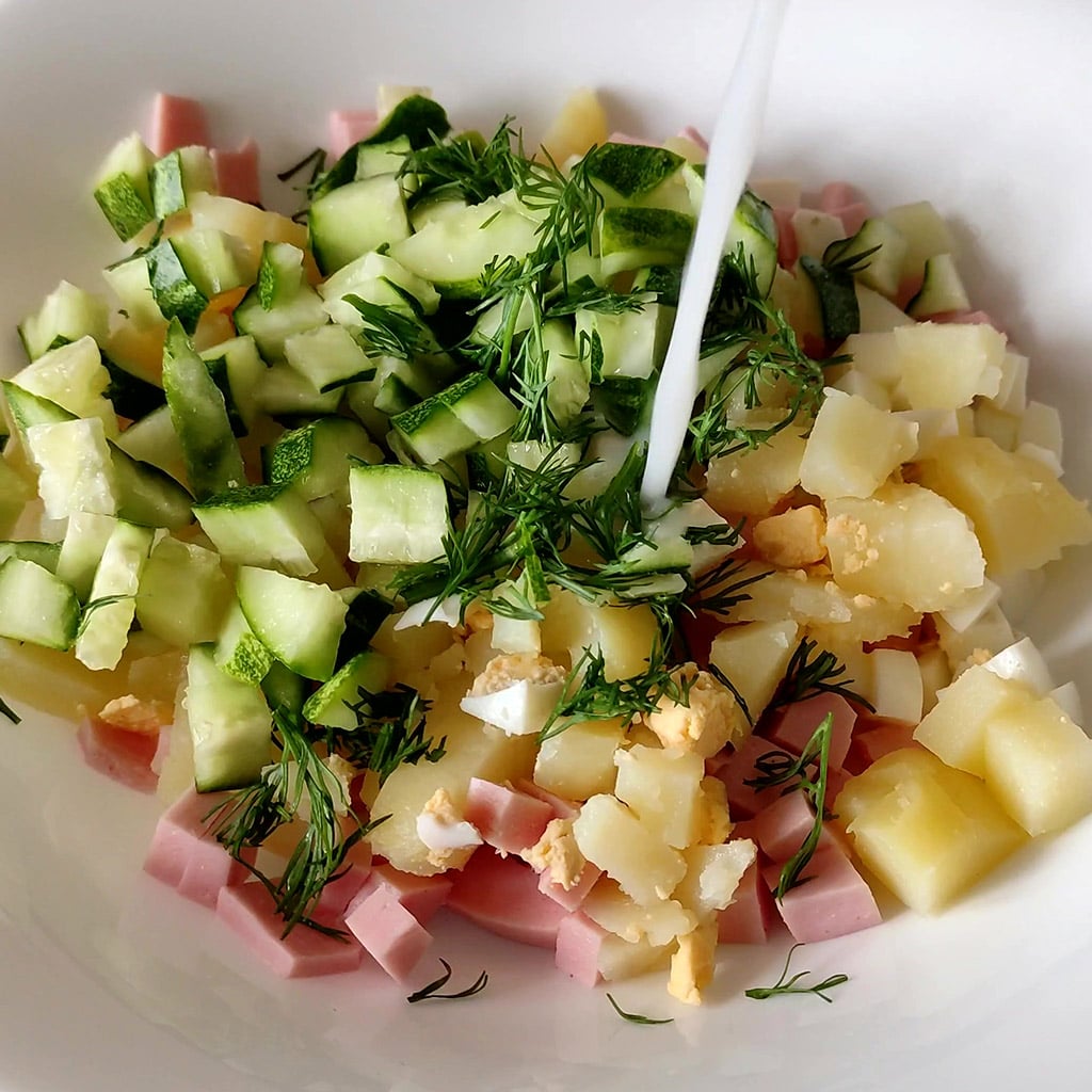 - Ну, а теперь все, как и в остальных рецептах: порезать все кубиками, измельчить зелень, смешать, добавить сметану/кефир и залить холодным бульоном.