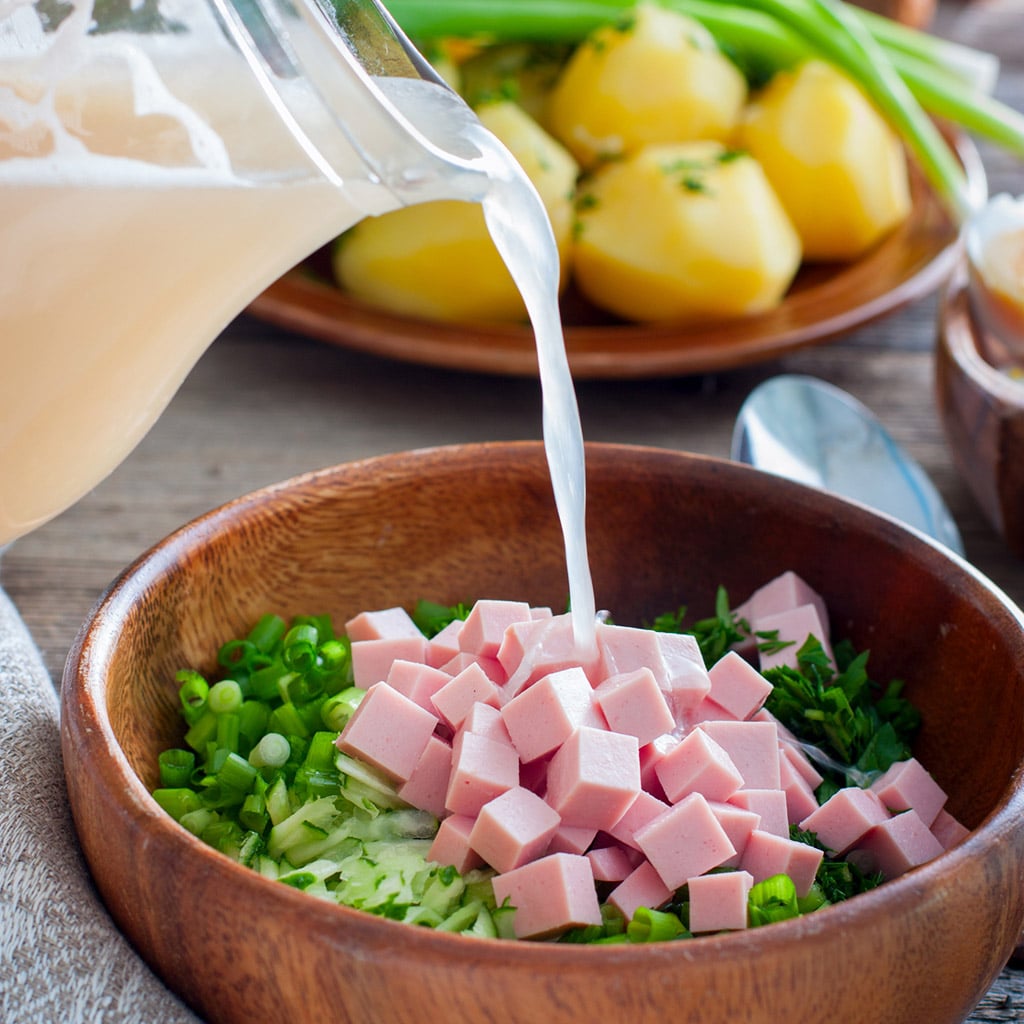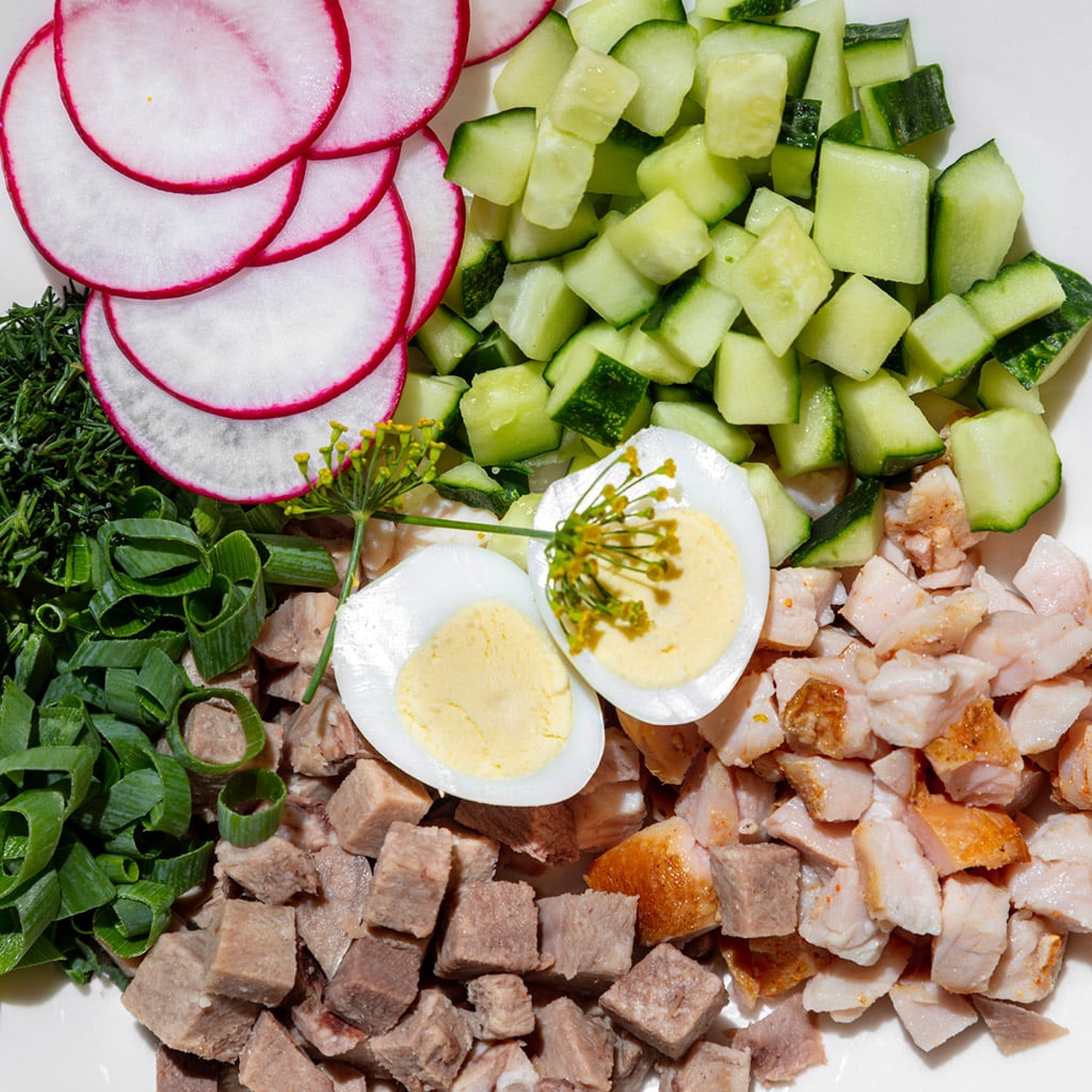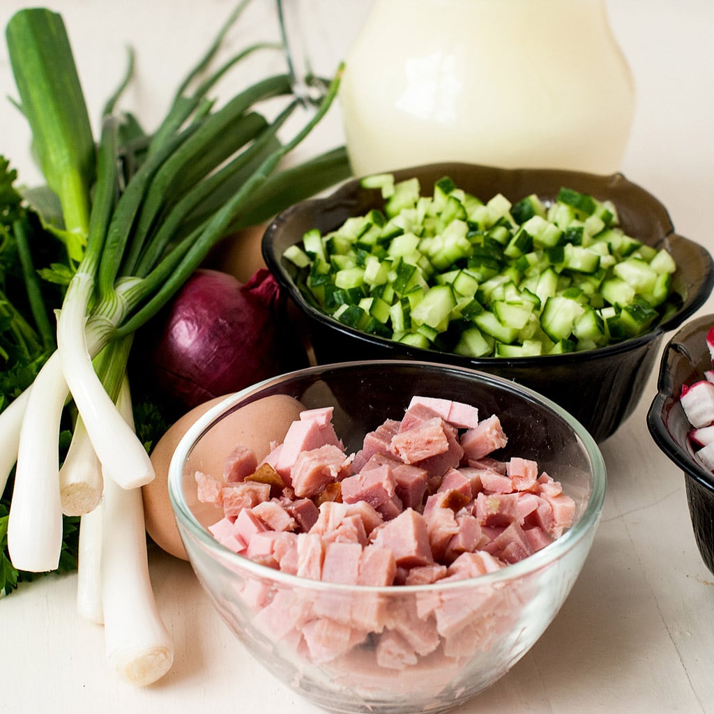 Эти шесть шагов – основа для приготовления, меняться будут только компоненты: колбаса или курица, квас или кефир. Движемся дальше, посмотрим пропорции и ингредиенты для каждого рецепта.