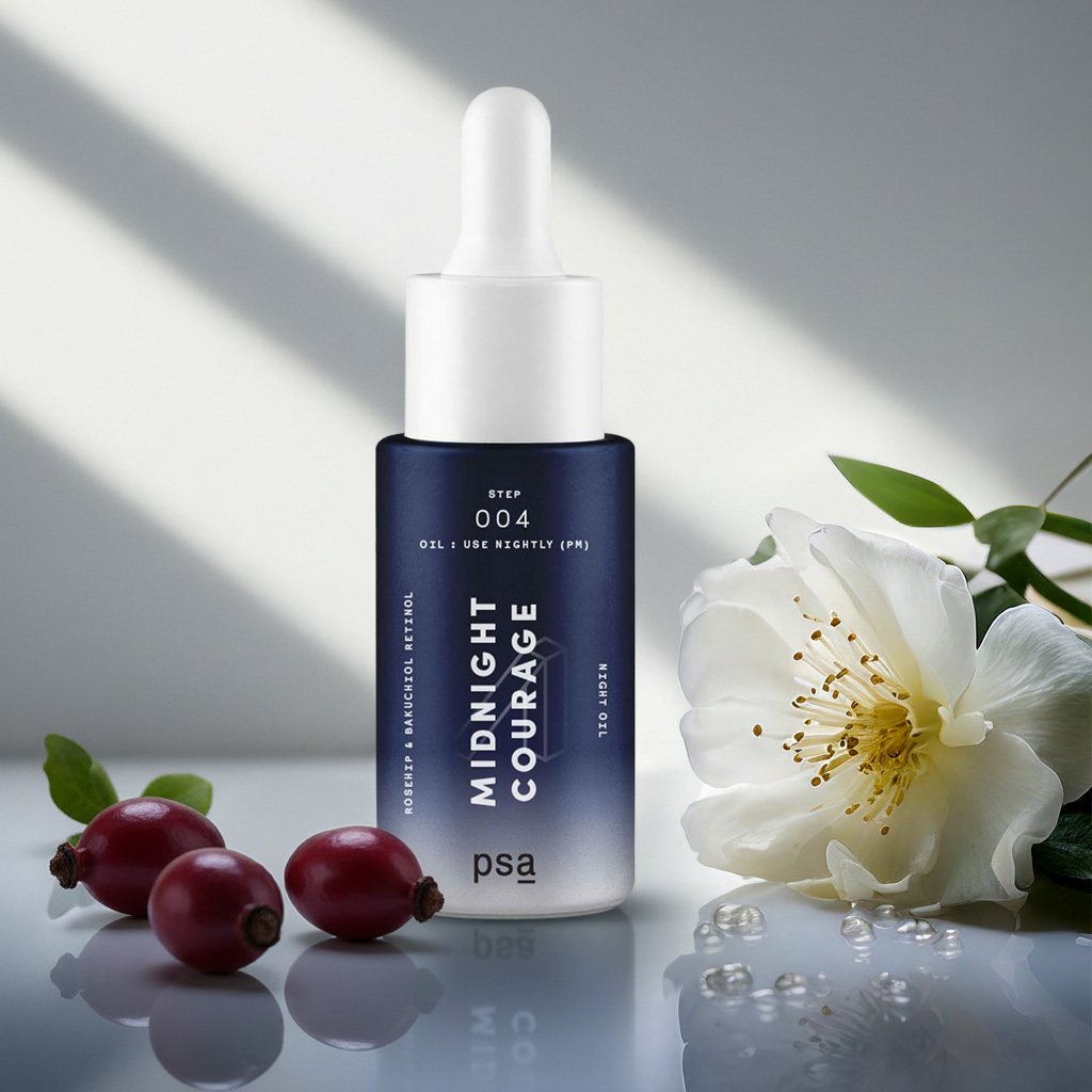 Хочешь, чтобы кожа становилась лучше, пока ты спишь? Тогда выбирай PSA Midnight Courage Rosehip & Bakuchiol Retinol Night Oil. Это активное масло для ночного ухода, которое работает на обновление, осветление и омолаживание. Его ключевые ингредиенты — ретиноидный комплекс (2%), бакучиол и растительные масла (шиповник, баобаб, гранат). Средство рассчитано на поддержку защитных функций кожи, борьбу с тусклым тоном, пигментацией, нежелательной текстурой и морщинками. Легкая текстура позволяет использовать масло как финальный шаг ночной рутины, либо его можно смешать с твоим любимым кремом. И не забудь утром про SPF.