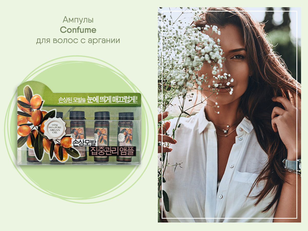 Confume — корейские бюджетные ампулы с маслом арганы для локонов, которые часто подвергаются термовоздействию, окрашиванию и укладке. Жирные насыщенные кислоты восстанавливают здоровье прядей и глубоко питают кожу головы.