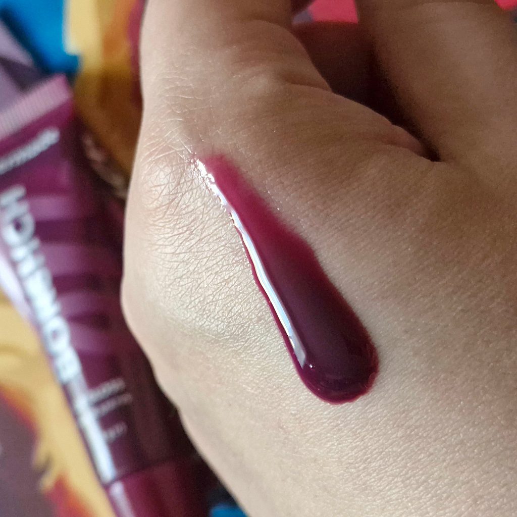 Тинтовый блеск Borshch имеет насыщенный свекольный оттенок с глянцевым финишем. Если нанести небольшую капельку и растушевать ее подушечкой пальца, то он удачно создает эффект «зацелованных губ». Если же равномерно распределить блеск по всей поверхности, то получится выразительный мейк с акцентом на губах. Спустя некоторое время оттенок адаптируется под тон кожи и становится более естественным, не таким интенсивным.