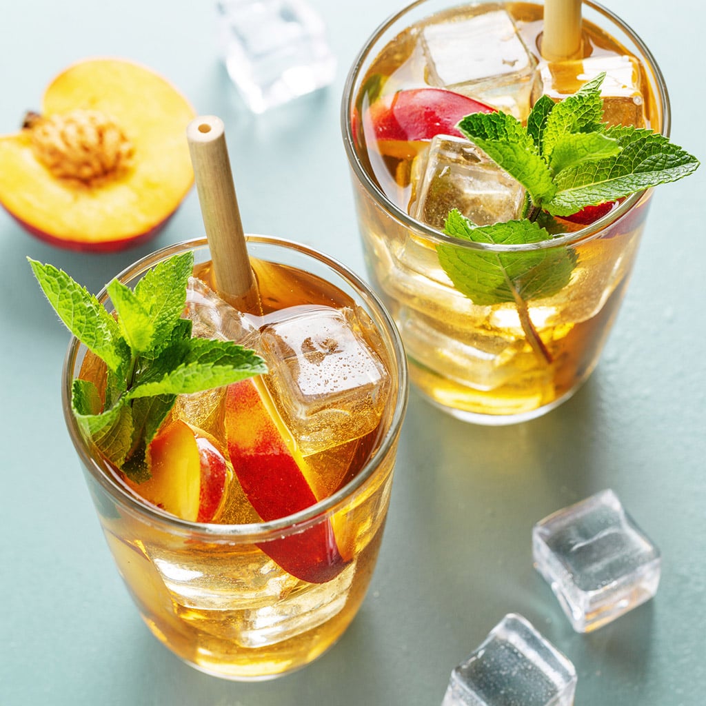 - Соединяем сироп с персиками и лимонным соком, заливаем оставшейся водой. Кладем в стаканы лед и наливаем наш персиковый лимонад. Можно украсить долькой персика.