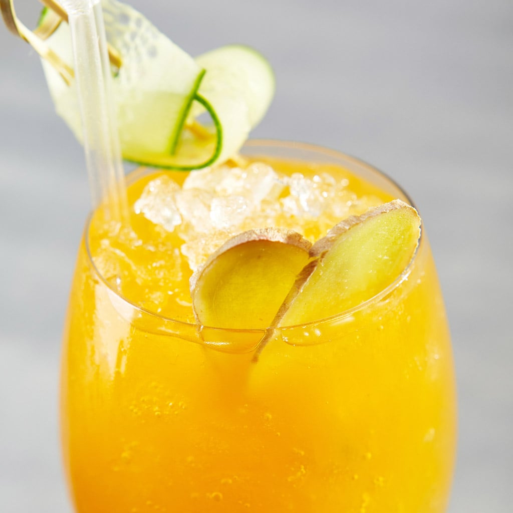 - Соединяем мякоть манго, огуречный и лимонный соки, сироп и заливаем водой.