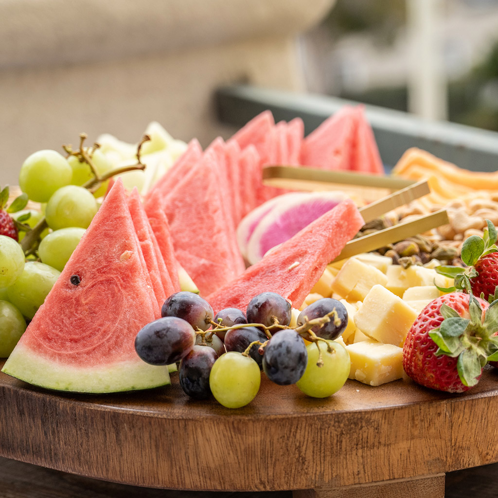 - летняя тарелка – дыня, сочный арбуз, виноград, малина, голубика, огурцы и помидоры черри;