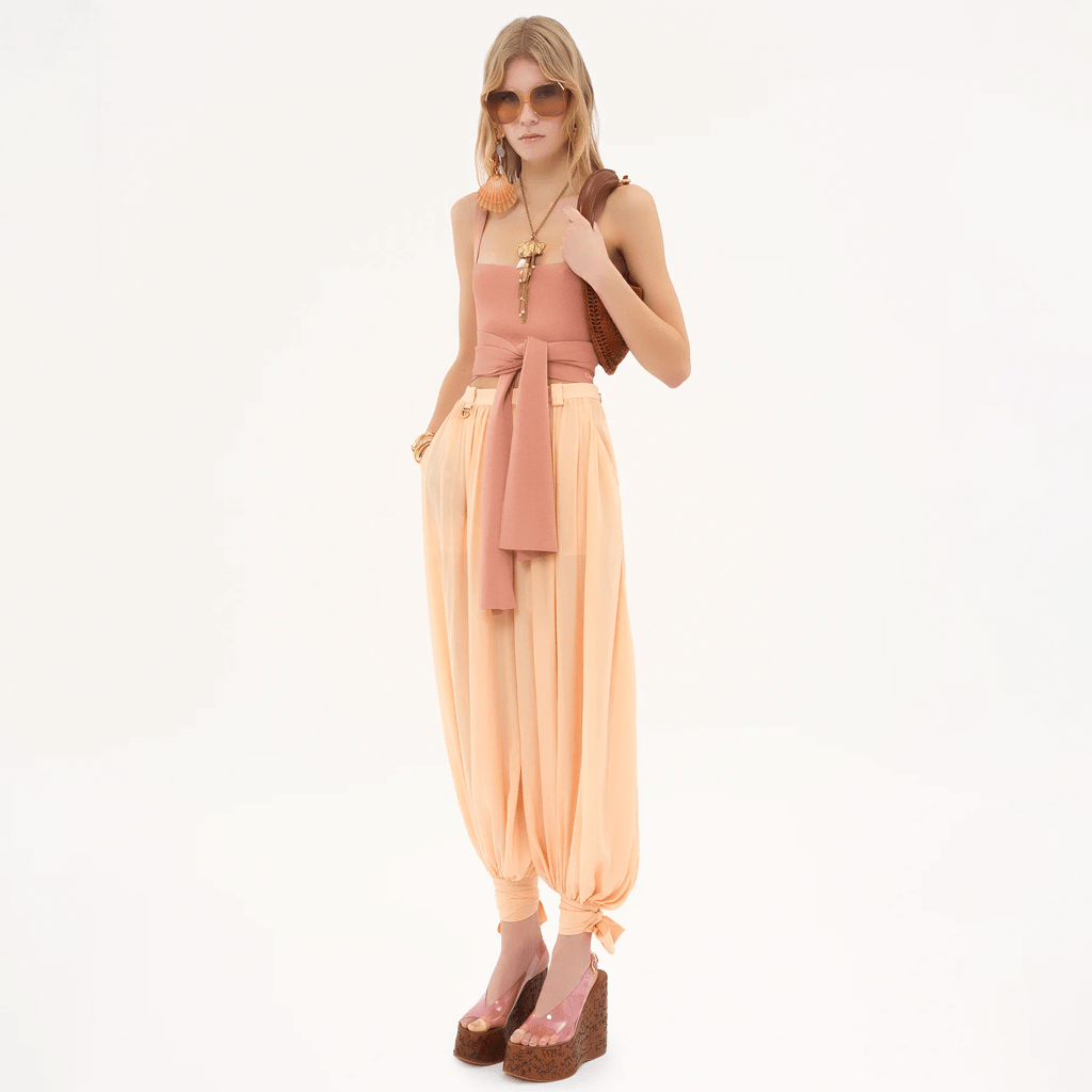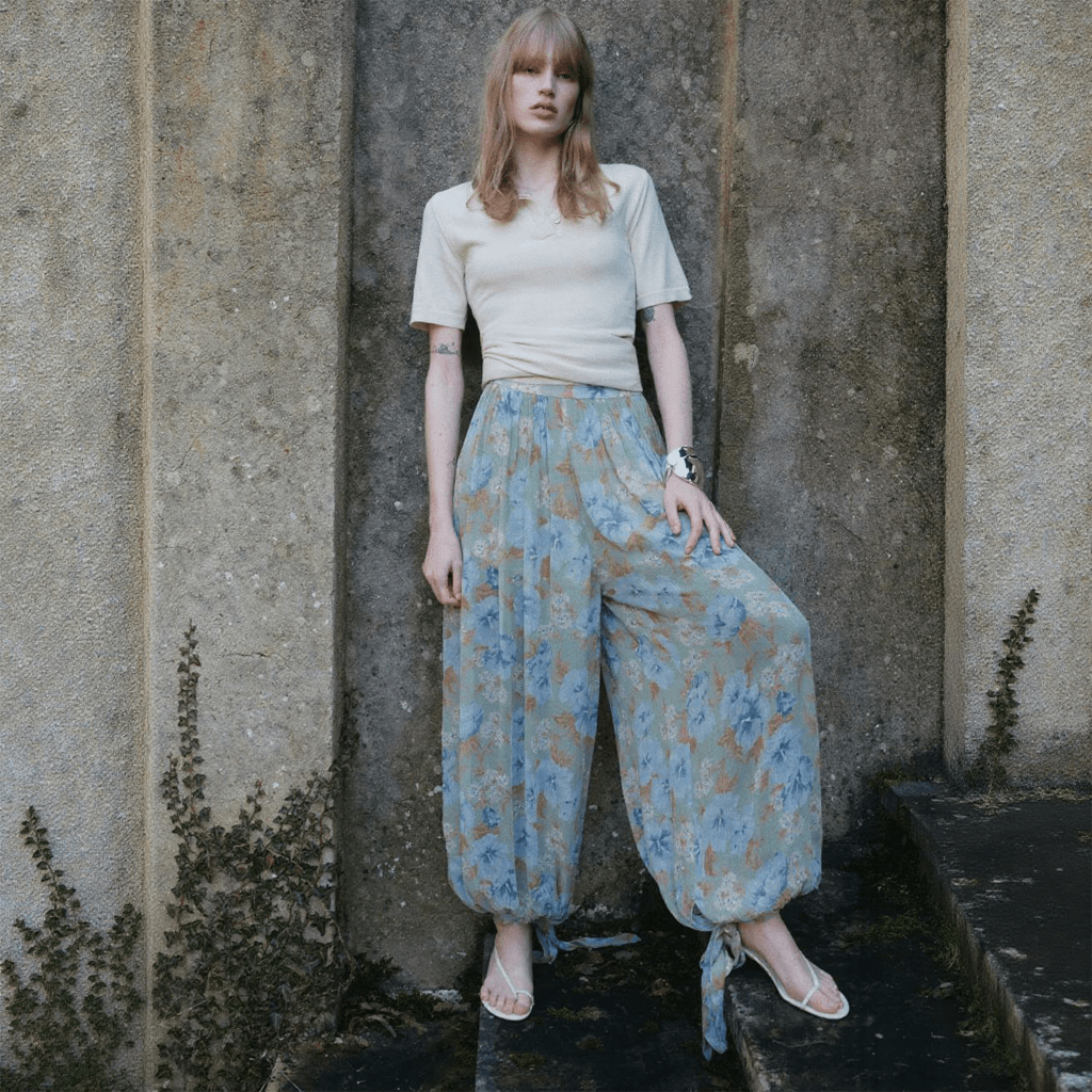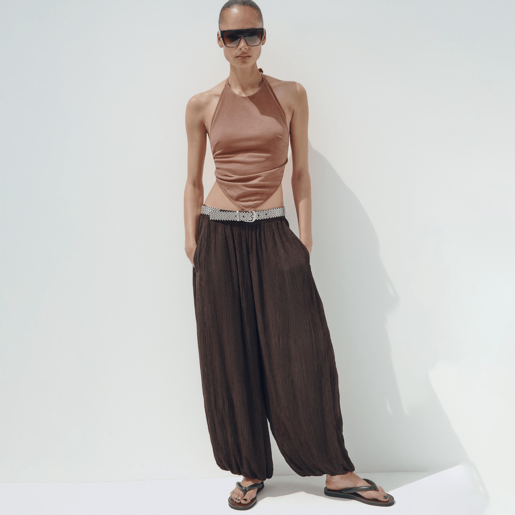 Несмотря на всю универсальность одежды, девушкам невысокого роста все же стоит носить “алладины” аккуратно, так как они визуально могут уменьшить рост. Есть ли какой-то выход из ситуации, если очень сильно хочется надеть шаровары? Безусловно! Выбирай не сильно широкие штаны с высокой талией и носи их с обувью на каблуке.