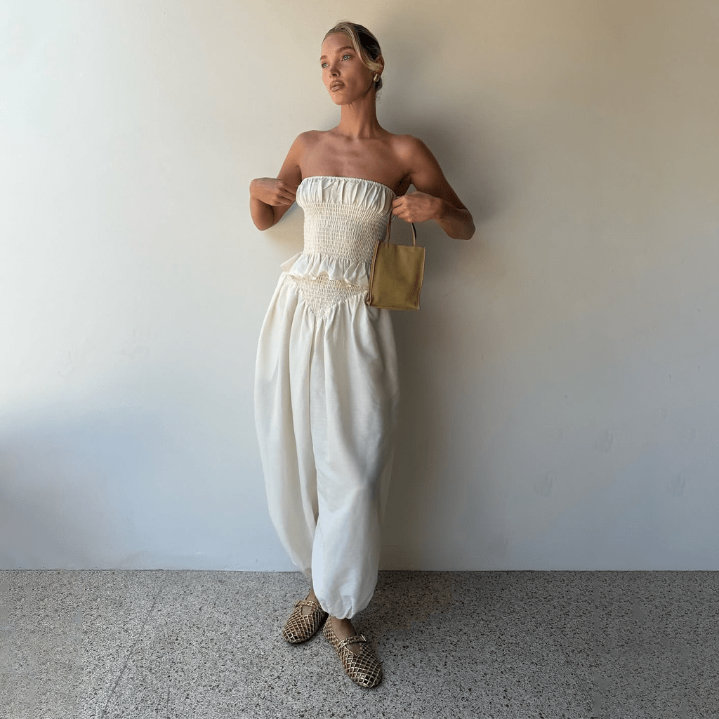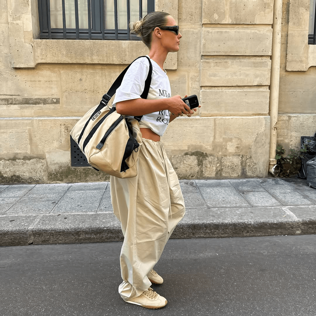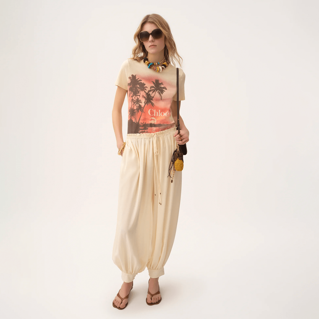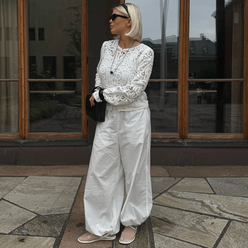 Несмотря на всю универсальность одежды, девушкам невысокого роста все же стоит носить “алладины” аккуратно, так как они визуально могут уменьшить рост. Есть ли какой-то выход из ситуации, если очень сильно хочется надеть шаровары? Безусловно! Выбирай не сильно широкие штаны с высокой талией и носи их с обувью на каблуке.