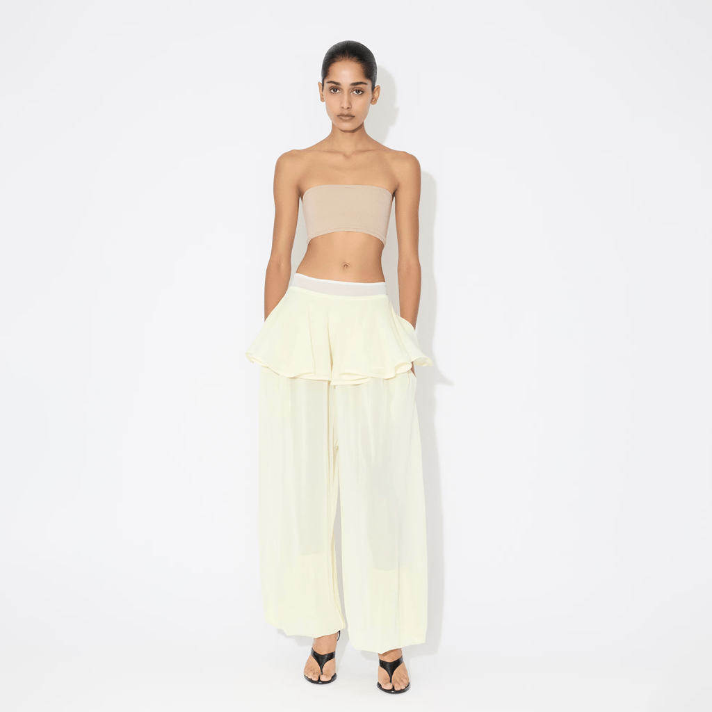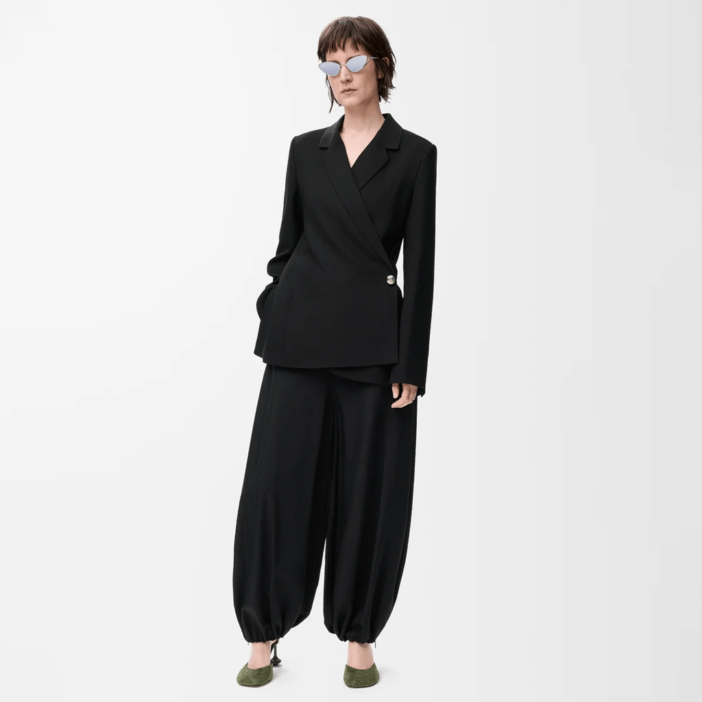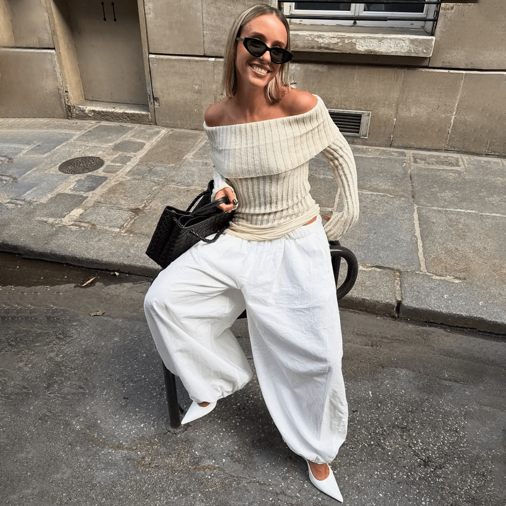 - Груша. Для девушек с широкими бедрами и узкими плечами стоит выбирать менее объемные штаны и желательно однотонные, чтобы визуально не увеличивать линию бедер. Сбалансировать образ поможет светлый или структурный верх, например, блуза с объёмными рукавами.