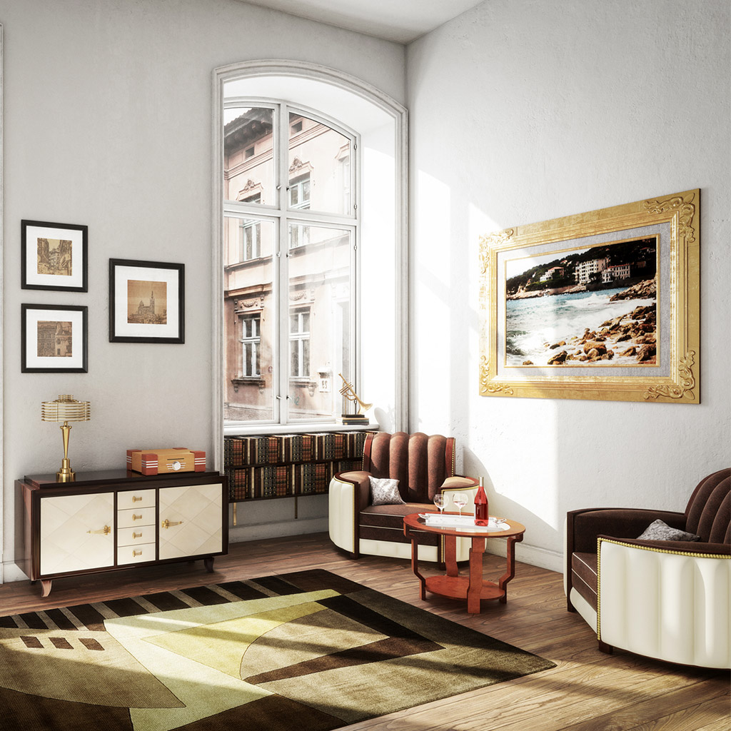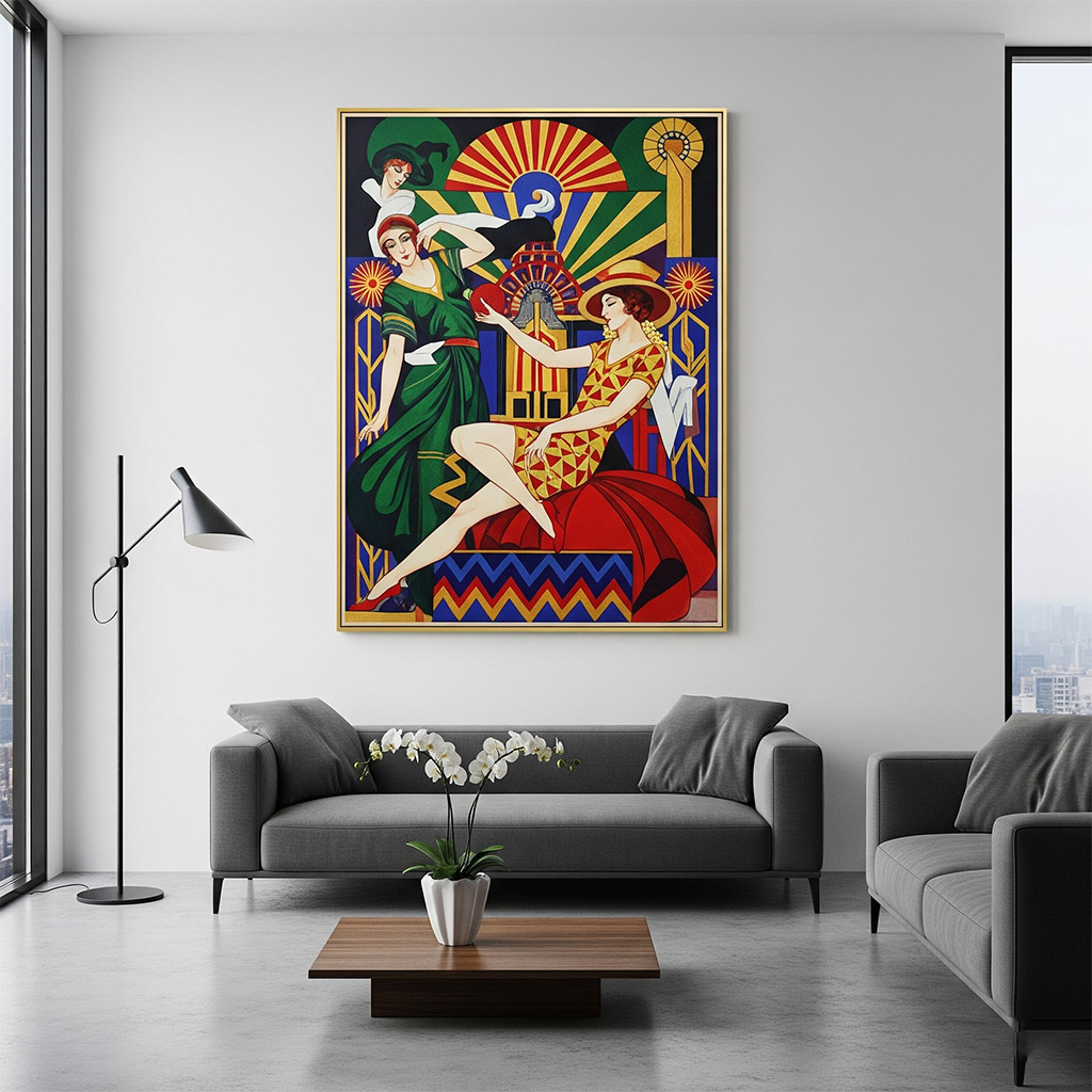 Ар-деко – это роскошь, блеск, гламур 1920-1930-х годов. Стиль, который использует четкую геометрию, симметрию, а в цветах отдает предпочтение золоту, благородному черному, насыщенному синему, богатому изумруду. Чаще всего на картинах изображаются пейзажи, архитектура или женские силуэты.