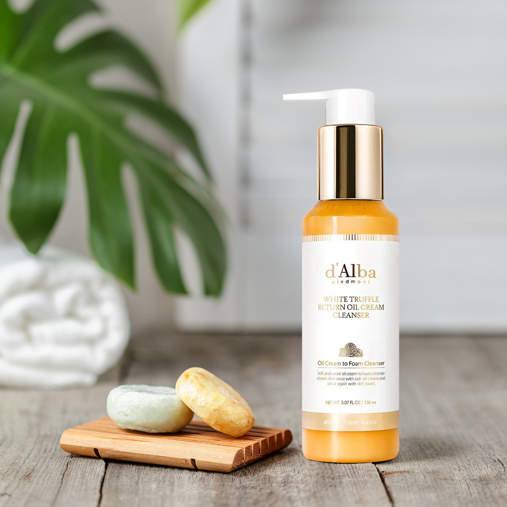 Очищающая крем-масло для лица D’Alba White Truffle Return Oil Cream Cleanser – легкое удаление макияжа и солнцезащитных средств без ощущения стянутости и дискомфорта. Двухфазное средство сначала наносится на сухую кожу для снятия основной массы загрязнений. При контакте с водой масло превращается в пенку, которая отлично справляется с остатками косметики, SPF-кремом и заодно убирает излишки себума. В составе целый комплекс растительных масел, в который входят девять природных компонентов, включая масло авокадо, макадамии, примулы вечерней, подсолнечника и т.д.