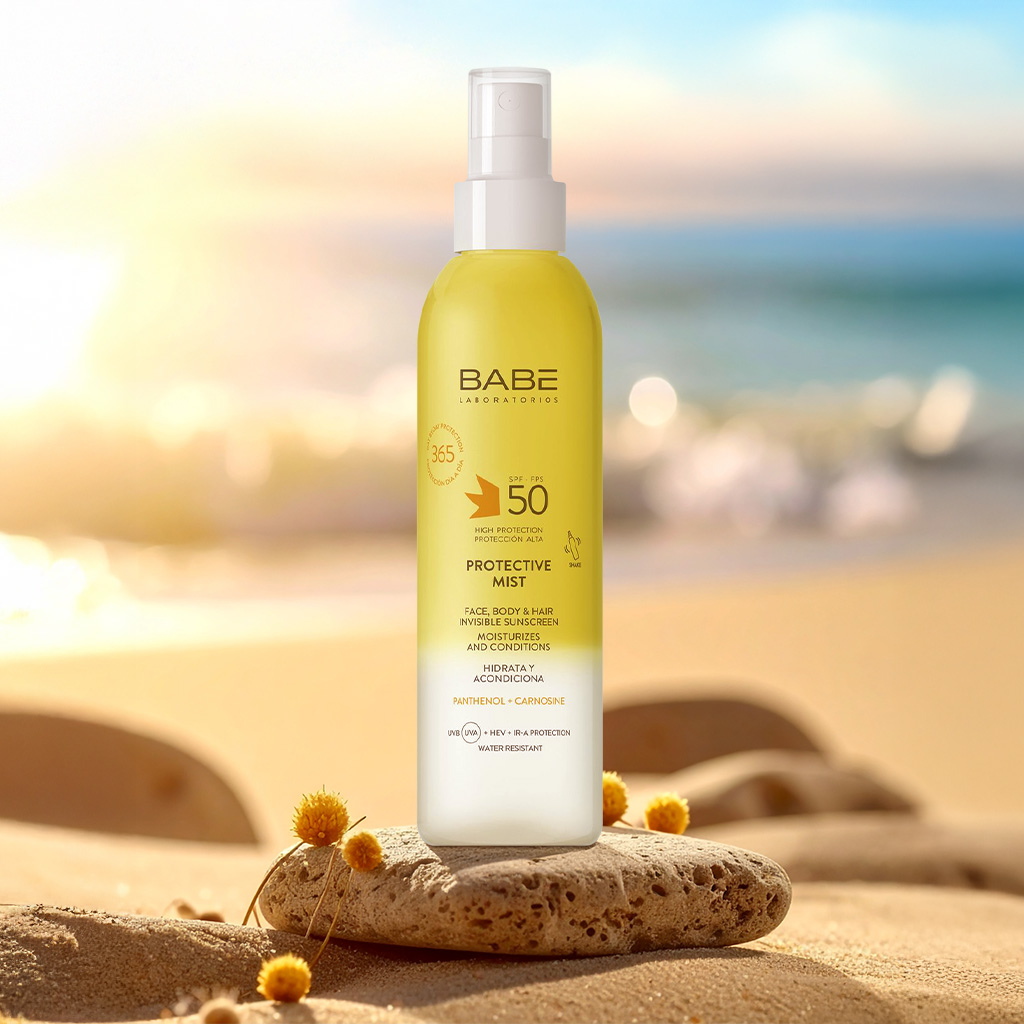 Сонцезахисний спрей-міст BABE Laboratorios Protective Mist формує невидимий захисний бар’єр, не залишає після себе липкості та слідів. Водостійка формула ідеально підходить для обличчя, тіла і волосся. Завдяки формату спрею наноситься швидко і рівномірно, моментально вбирається.