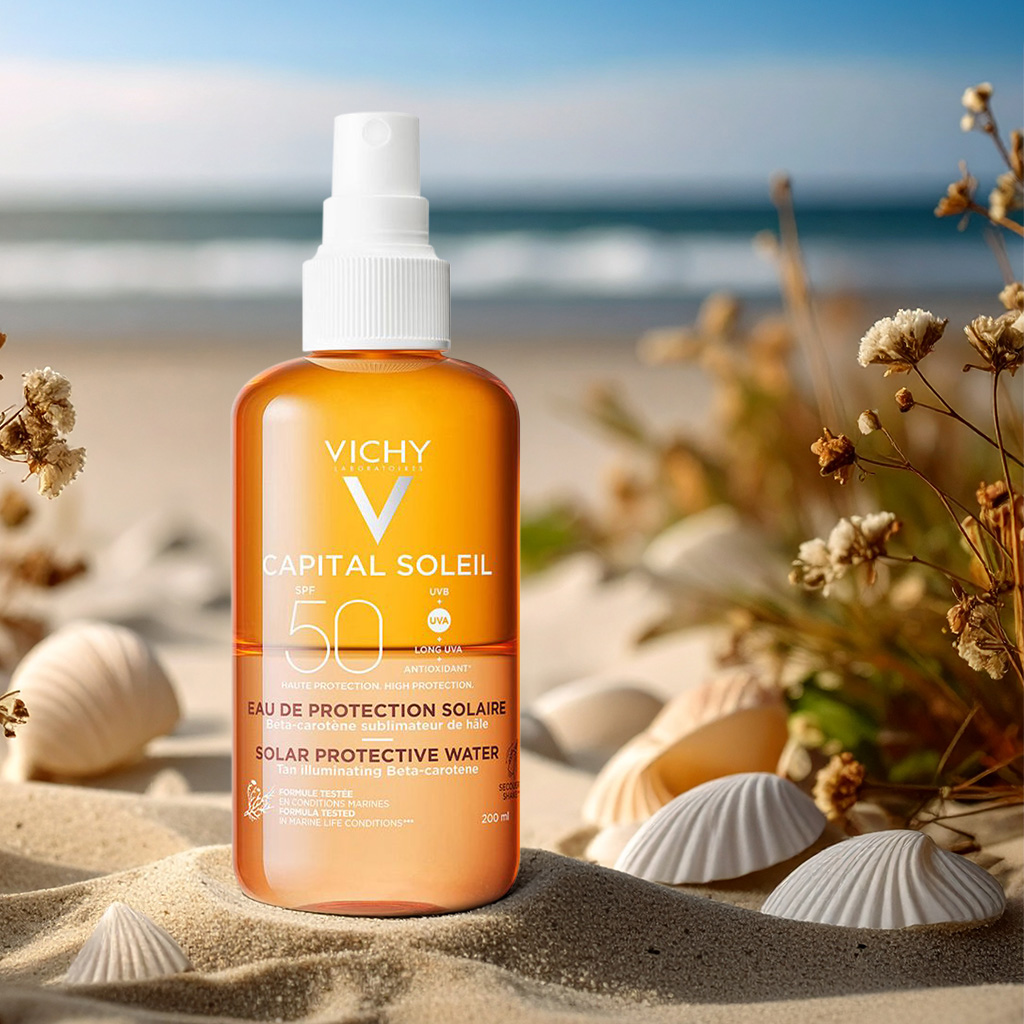 Спрей Vichy Capital Soleil Solar Protective Water може похвалитися високим ступенем захисту – SPF 50. У складі ти знайдеш бета-каротин, який допомагає шкірі засмагнути рівномірно, термальну воду для зміцнення шкірного бар’єра і додаткового зволоження, а також вітамін Е для нейтралізації вільних радикалів.