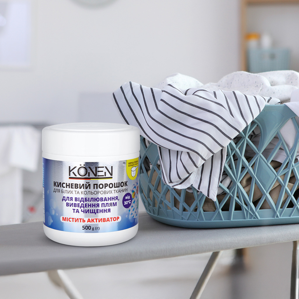 Цей засіб від бренду KONEN без зусиль справляється з плямами від вина, кави, чаю, ягід, а також слідами дезодоранту, поту і косметики. Завдяки впливу активного кисню на тканини можна позбутися навіть застарілих забруднень. Засіб усуває жовтизну і сірість речей, при цьому без шкоди для одягу.