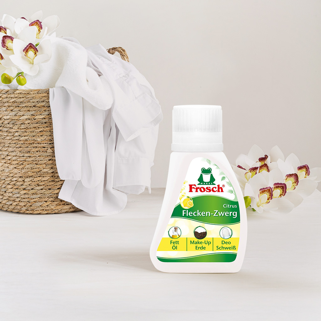 У випадках, коли для боротьби зі стійкими плямами звичайного порошку недостатньо, на допомогу приходить засіб для виведення плям Frosch. Він легко усуває сліди від трави, фруктів, шоколаду, червоного вина, поту і косметики, зберігаючи при цьому структуру тканини. Засіб підходить для будь-яких матеріалів, добре працює як із кольоровими, так і білими речами.
