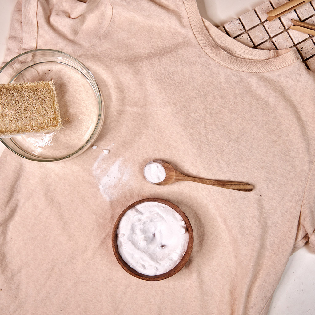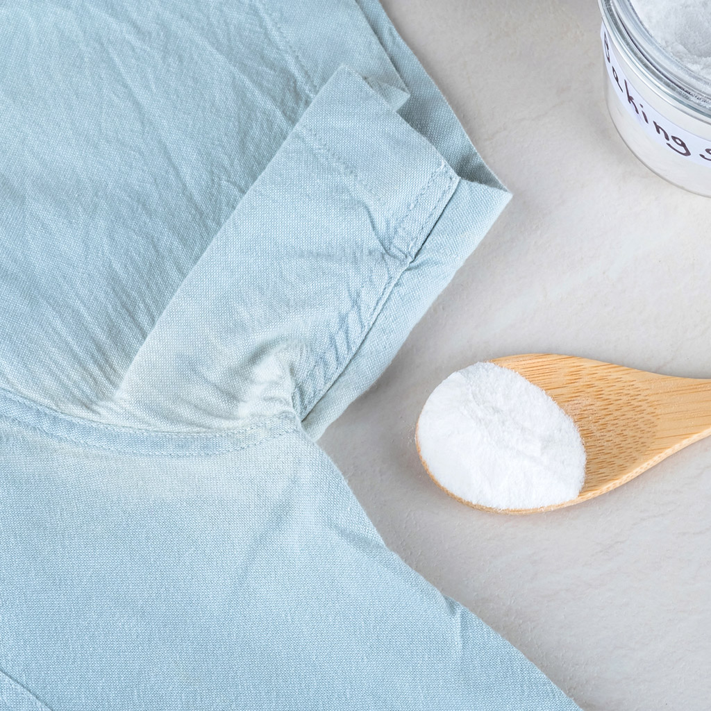 Сода діє як м’який абразив і добре видаляє запахи поту. Розведи 2-3 столові ложки соди в невеликій кількості води до стану кашки, нанеси на пляму, гарненько потерши, і залиш на 1 годину. Після цього випери одяг.