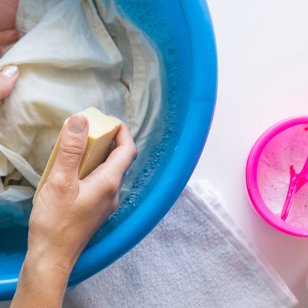Класичний і перевірений метод – натерти пляму господарським милом, залишити на 30 хвилин і потім випрати. Найкраще використовувати мило з вмістом 72% жирних кислот – воно більш ефективне. Підходить для будь-яких тканин, крім делікатних (шовк, вовна).