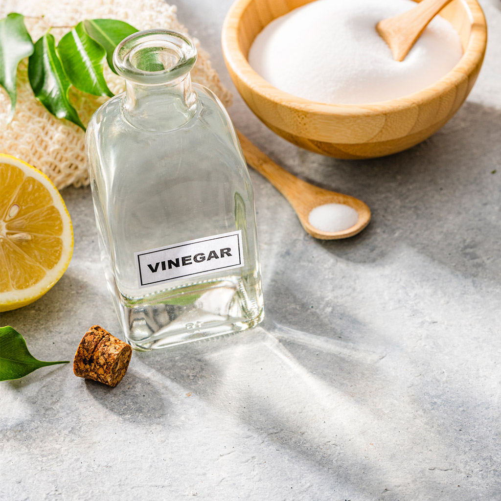 Столовий оцет (9%) допомагає розчиняти плями та усуває неприємний запах. Налий оцет на пляму або оброби її за допомогою ватного диска. Залиш на 15 хвилин і випери. Не варто застосовувати оцет на світлих тканинах, оскільки він може залишати жовті плями. Також не використовуй на делікатних речах, щоб не зіпсувати їх.